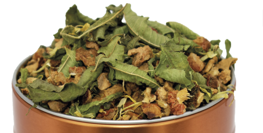 Pomme*, verveine entière*, mélisse*, arôme naturel d’orange, écorces d’orange*, Tulsi*, fleurs de souci*, Huile essentielle de mandarine*, fleurs de houblon*, alchémille*, valériane*, sarriette*.