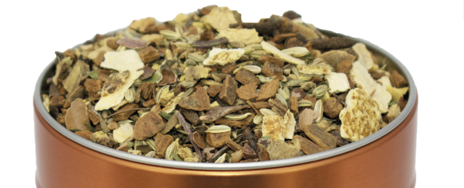 Bâtons de cannelle*, fenouil*, gingembre*, écorces d’orange*, cannelle Ceylan*, anis*, racine de réglisse*, fève de cacao concassée*, clou de girofle*, Tulsi*, dent-de-lion*, ananas*.