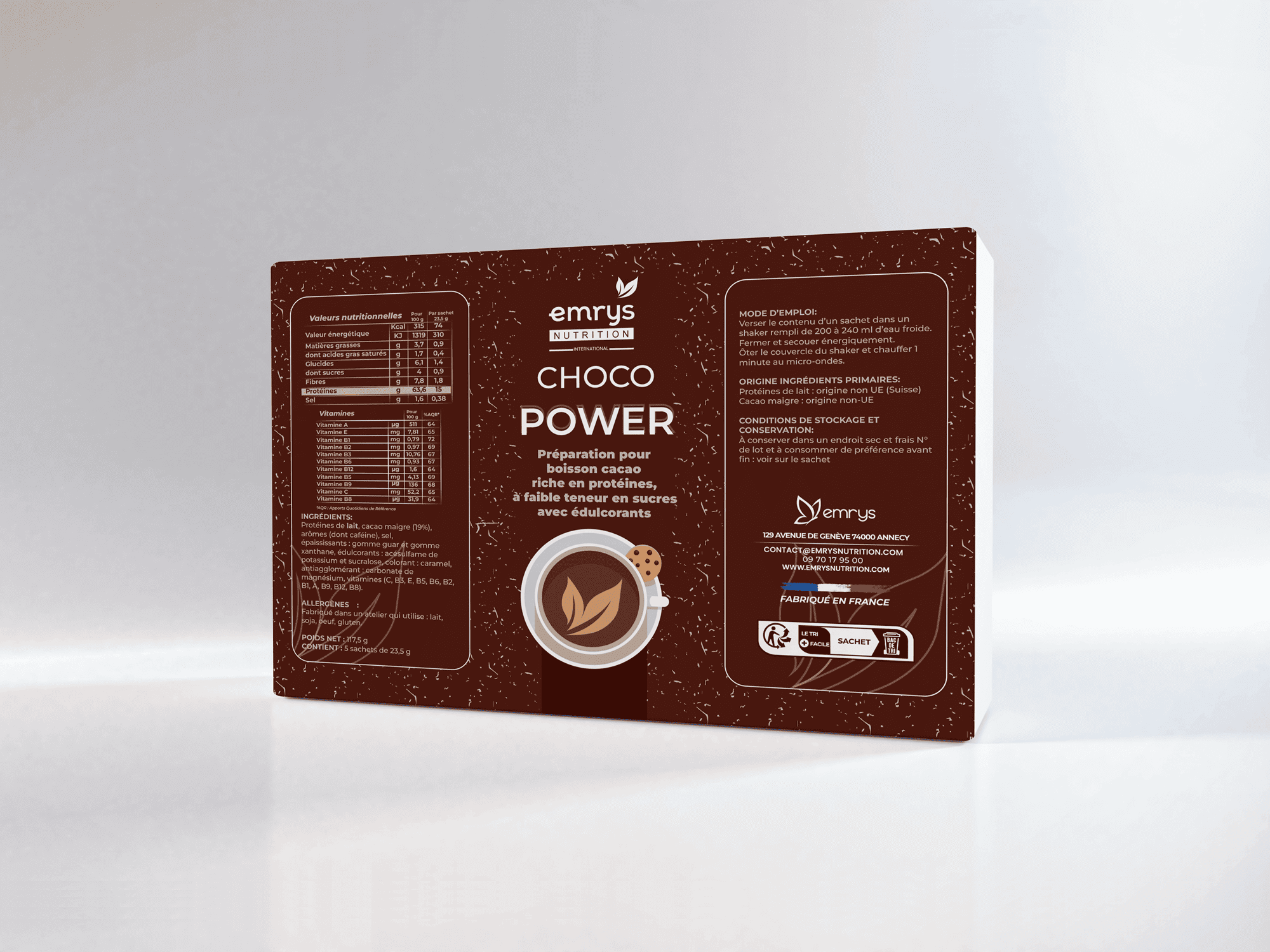 Préparation pour boisson cacao riche en protéines et pauvre en sucres, avec édulcorants. Source de fibres et de vitamines A, E, B1, B2, B3, B6, B12, B5, B9, C et B8.