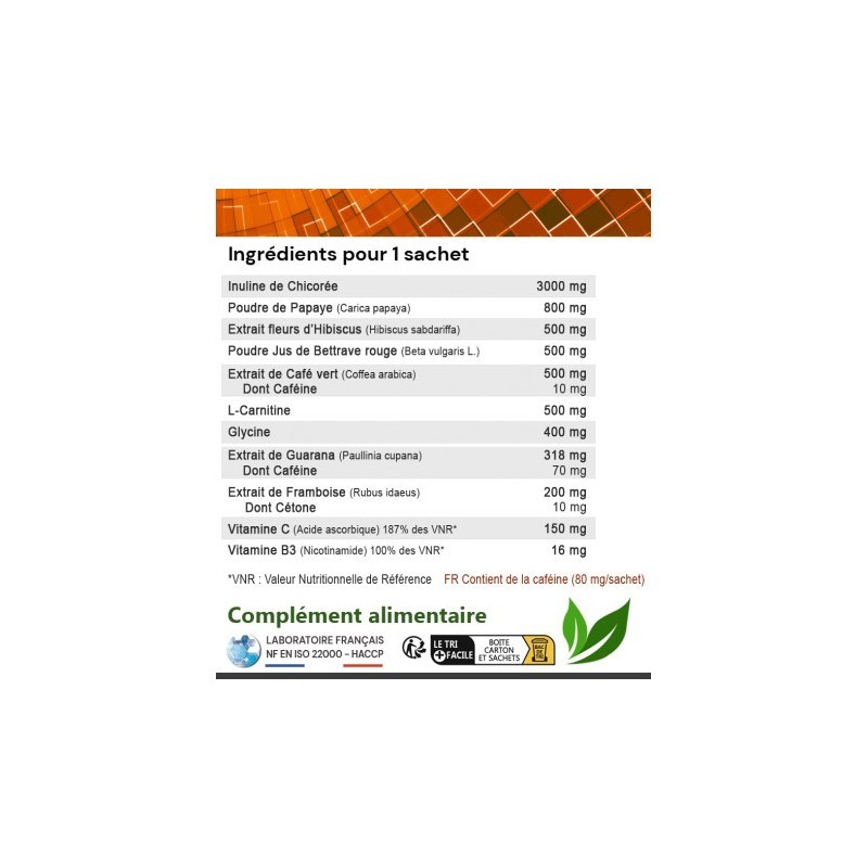 Inuline de Chicorée (3000mg) - Poudre de Papaye (800 mg) – Erythritol (600 mg) – Extrait d’Hibiscus (500 mg) – Poudre de jus de Betterave rouge (500 mg) – Extrait de Café vert (500 mg) – L-Carnitine (500 mg) – Glycine (400 mg) – Extrait de Guarana (318 mg) - Arôme naturel de Framboise – Extrait de Framboise (200 mg) (cétones) – Vitamine C (150 mg) – Vitamine B3 (16 mg) – Stévia